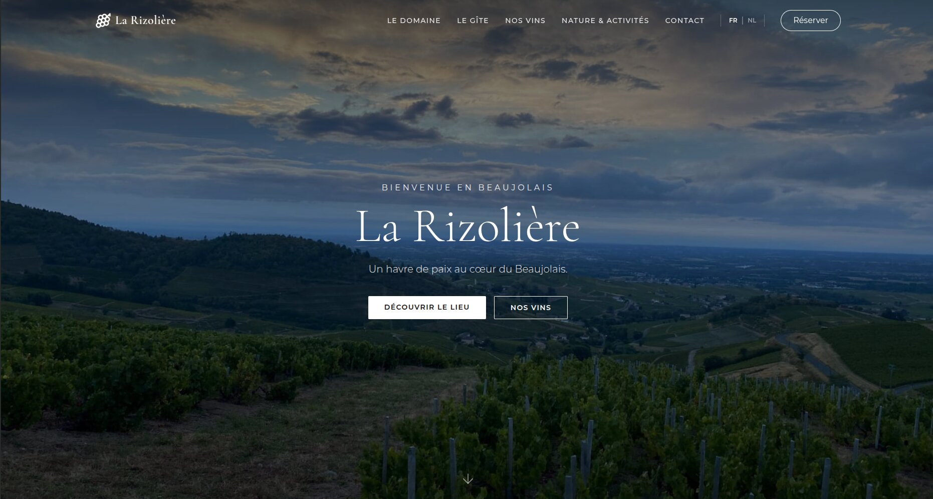 La Rizolière est un domaine viticole familial labellisé HVE (Haute Valeur Environnementale) situé à Vauxrenard, au cœur du Beaujolais. Didier et Marieke Canard, vignerons passionnés depuis plus de 30 ans, proposent à la fois une production de vins (Gamay, Chardonnay) et un gîte de charme classé Gîtes de France. Ils avaient besoin d'une vitrine digitale à la hauteur de leur terroir pour capter une clientèle touristique française et néerlandophone.